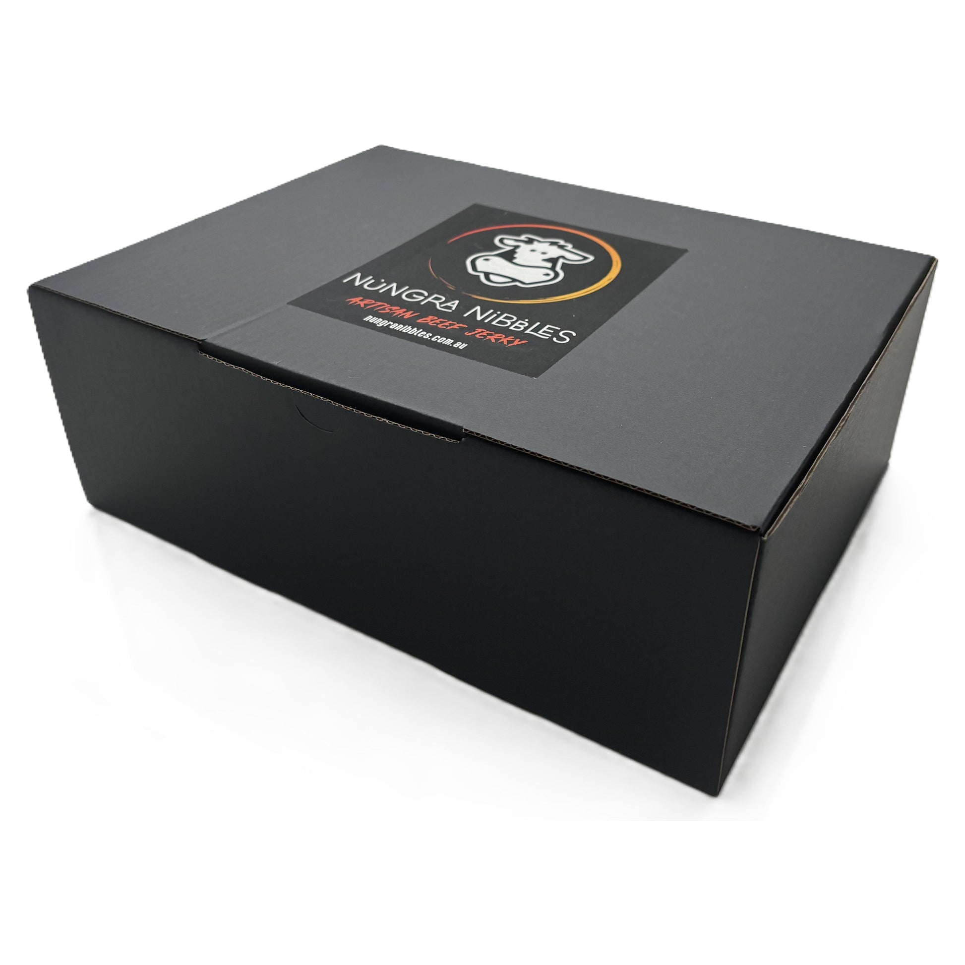 Ideal for larger gifting, this premium gift box holds 4-12 packs of Nungra Nibbles snacks, perfect for any occasion. Each box is carefully packed with your selected snacks, wrapped in luxurious black tissue paper, and shipped inside a standard shipping box with foam peanuts for safe delivery.